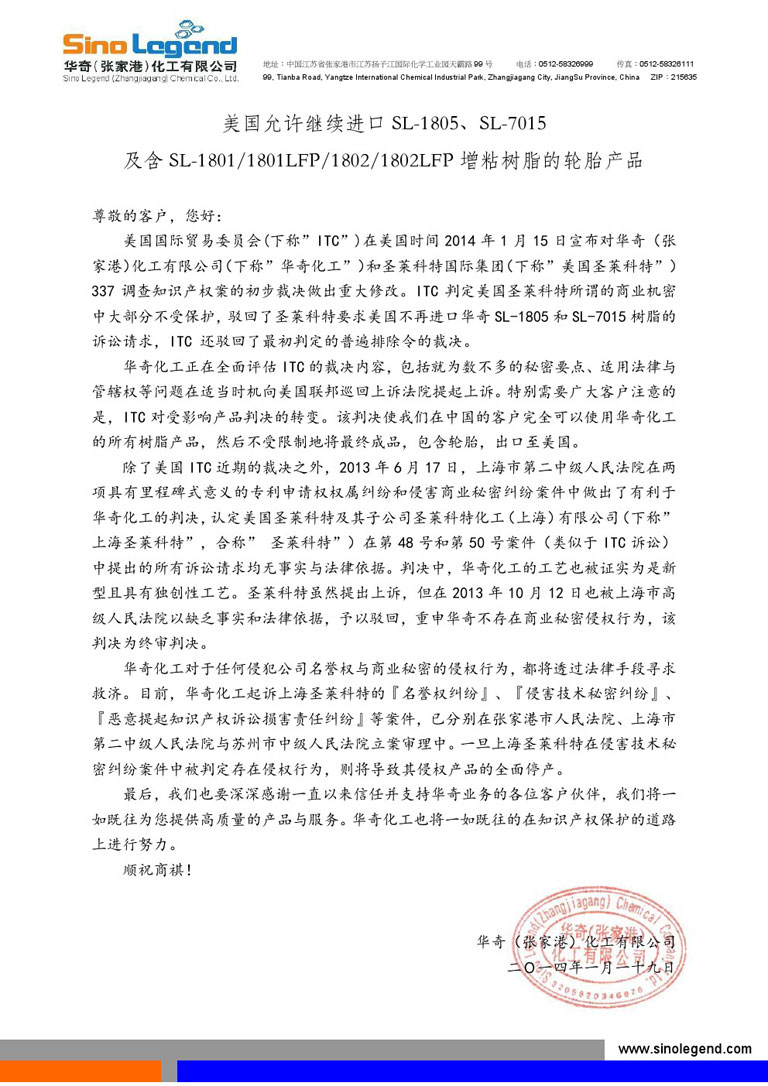 中国法院判决华奇胜诉后,美国ITC终裁允许进口SL-1805、SL-7015树脂及含SL-1801类增粘树脂的轮胎产品